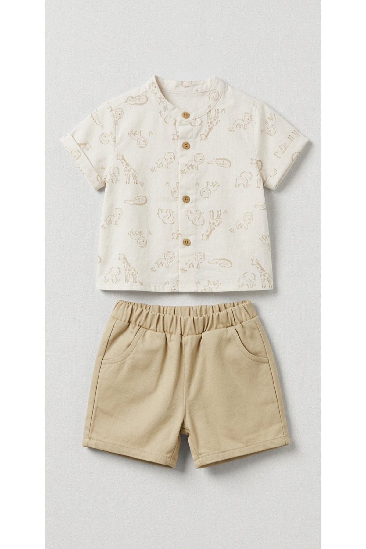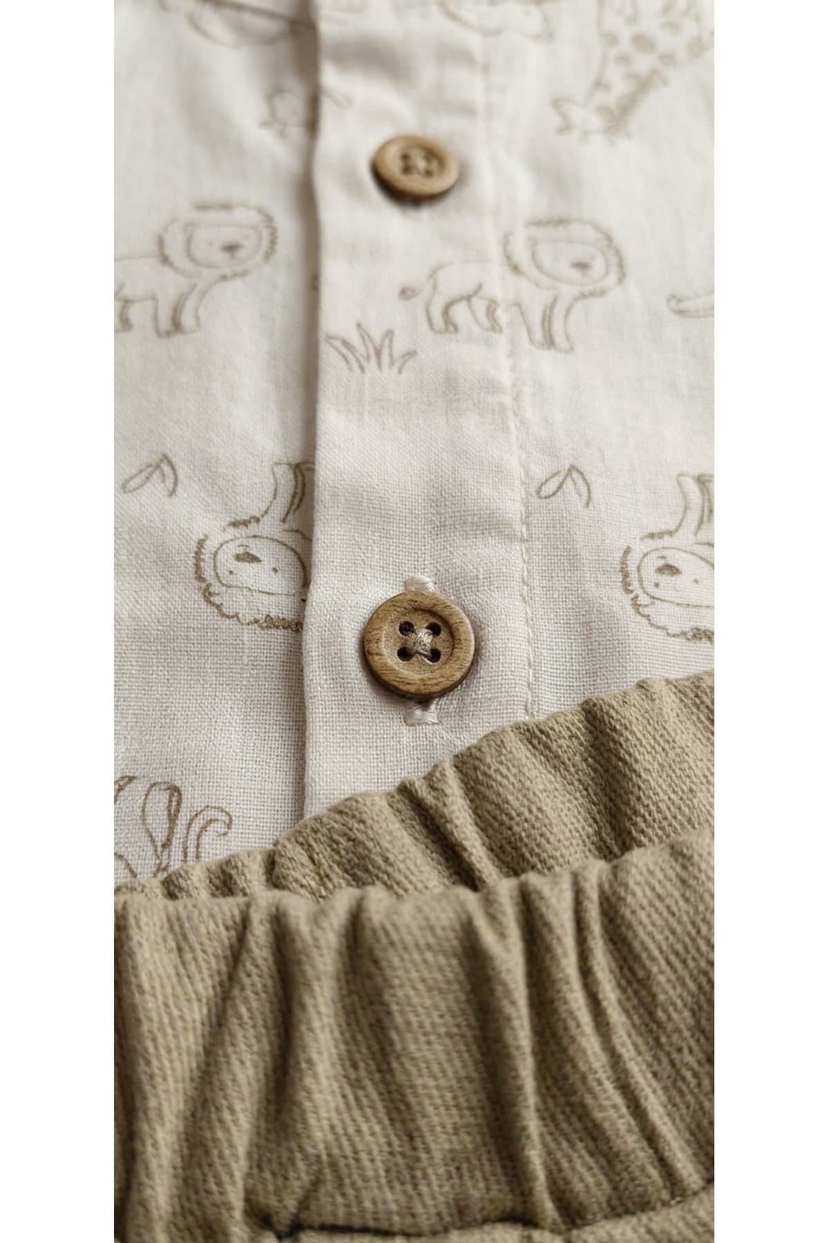 Üstü safari/hayvan desenli (aslan, zürafa vb.), ahşap düğmeli hakim (yakasız) krem kısa kol gömlek ve esnek belli bej/kamel cepli dokuma keten yazlık şort ikilisi. 3 Aydan 4 yaşa kadar minikler için doğa dostu erkek bebek gömlek şort dokuma takım, yaz tatilleri ve özel günler için çok satılan %100 rahat çocuk giyim hitlerinden biridir.