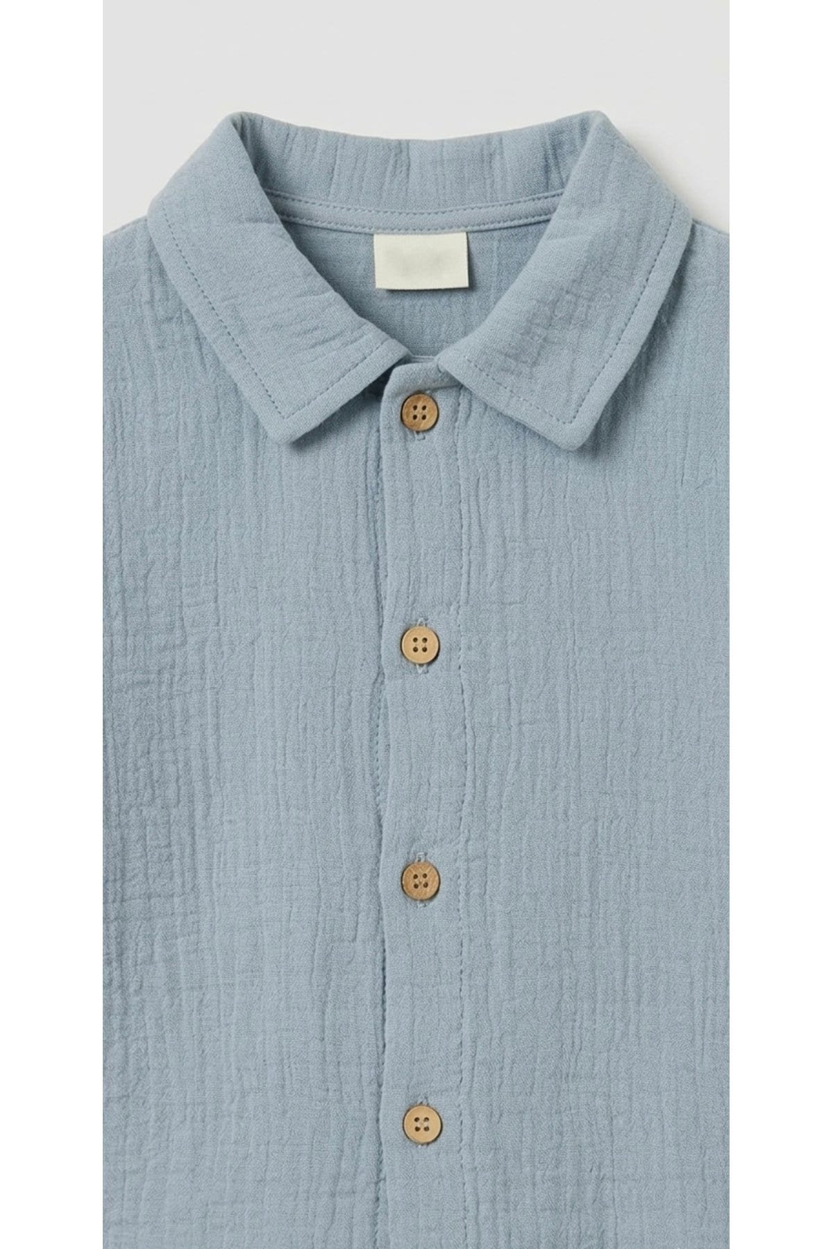 Modern anneler için tatilde veya yorucu bebek bakım sürecinde işleri zorlaştıran ütü problemi artık tarih oldu. Takımın üst parçası; kendinden hafif buruşuk, pürüzlü ve dalgalı yapısıyla bilinen orijinal “müslin” (muslin) kumaştan imal edilmiştir. Kısa kollu ve serinletici yapıya sahip gömleğin yakası modele spor-şık (Smart Casual) bir hava katarken, ön kısımdan aşağı doğru uzanan tamamen doğal görünümlü ahşap düğmeleri çok asil durmaktadır. Denize girip çıkıldığında veya kirlendiğinde saniyeler içinde kurur.