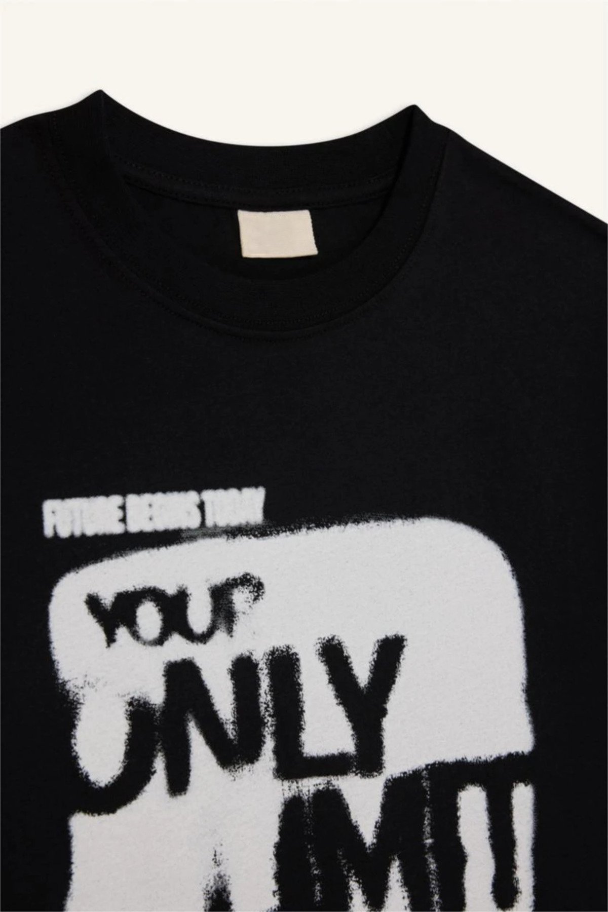 Baskının estetik gücü, yazıların spray boya dokusunu taklit eden bulanık ve serbest akışlı üslubuyla ortaya çıkıyor. Beyaz zemin üzerinde siyah harflerin yarattığı iç kontrast, t-shirt’ün siyah zemininde de ayrı bir derinlik katmanı oluşturuyor. Sokak sanatından ilham alan bu tipografi yaklaşımı, çocuk giyim trendlerinde gençlerin en çok benimsediği grafik anlatım biçimlerinden biri. Büyük ölçekli ve merkeze odaklanan baskı, ürünü karşıdan bile anında fark ettiriyor.
