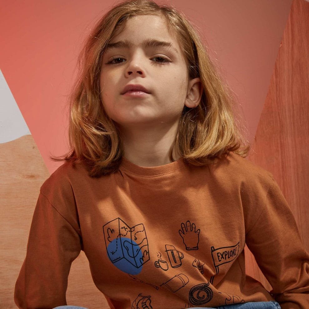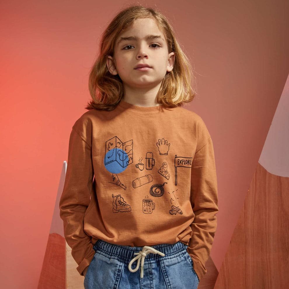 Canlı ve dikkat çekici baskısı ile bu çocuk t-shirt modeli, miniklerin favorisi olacak. Kahverengi tonunun doğallığı, üzerindeki eğlenceli baskılarla birleşerek modern ve enerjik bir görünüm sunar. Yaz aylarında tek başına, serin günlerde ise ceket veya sweatshirt altına giyilebilecek ideal bir parçadır.