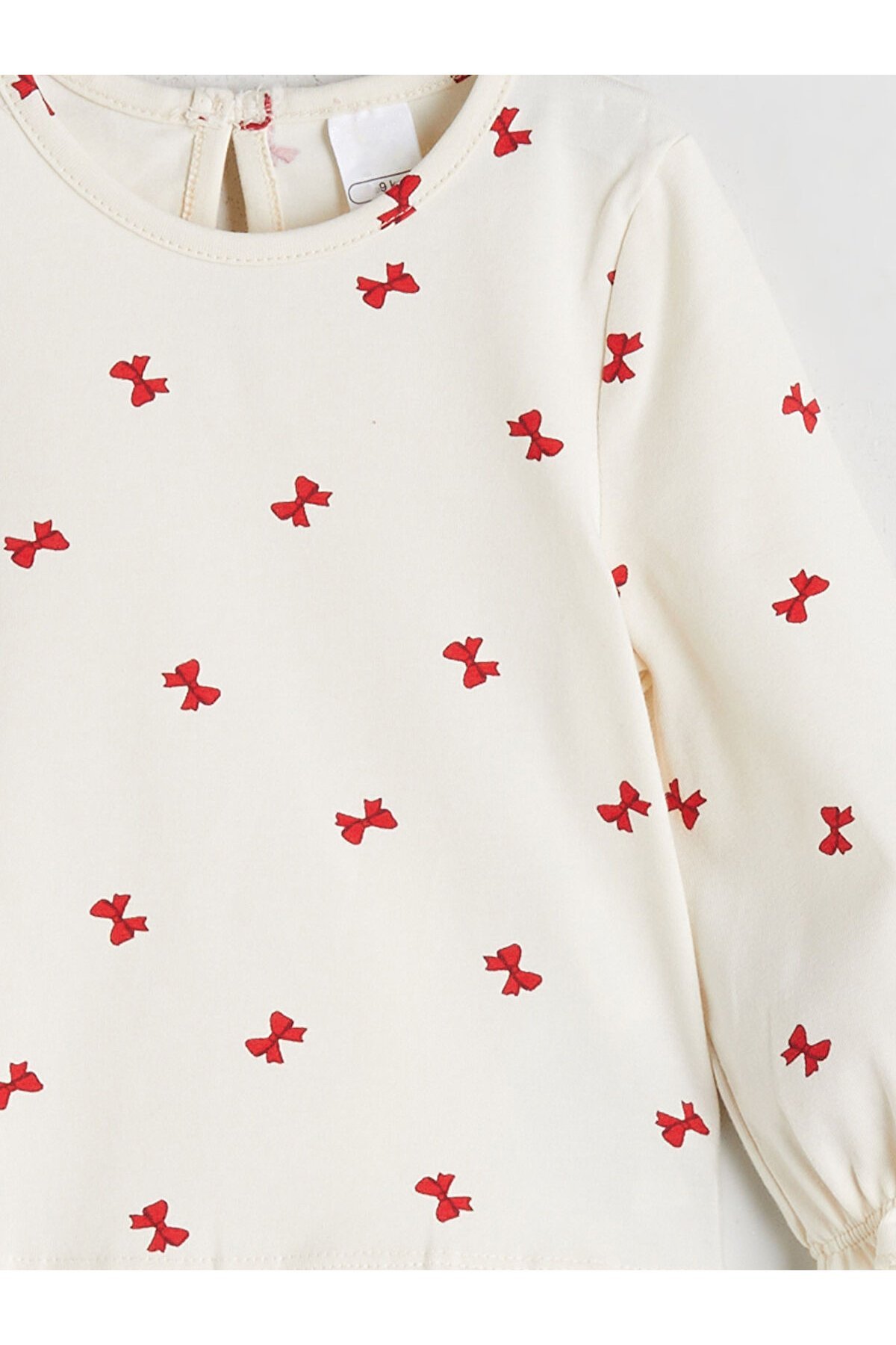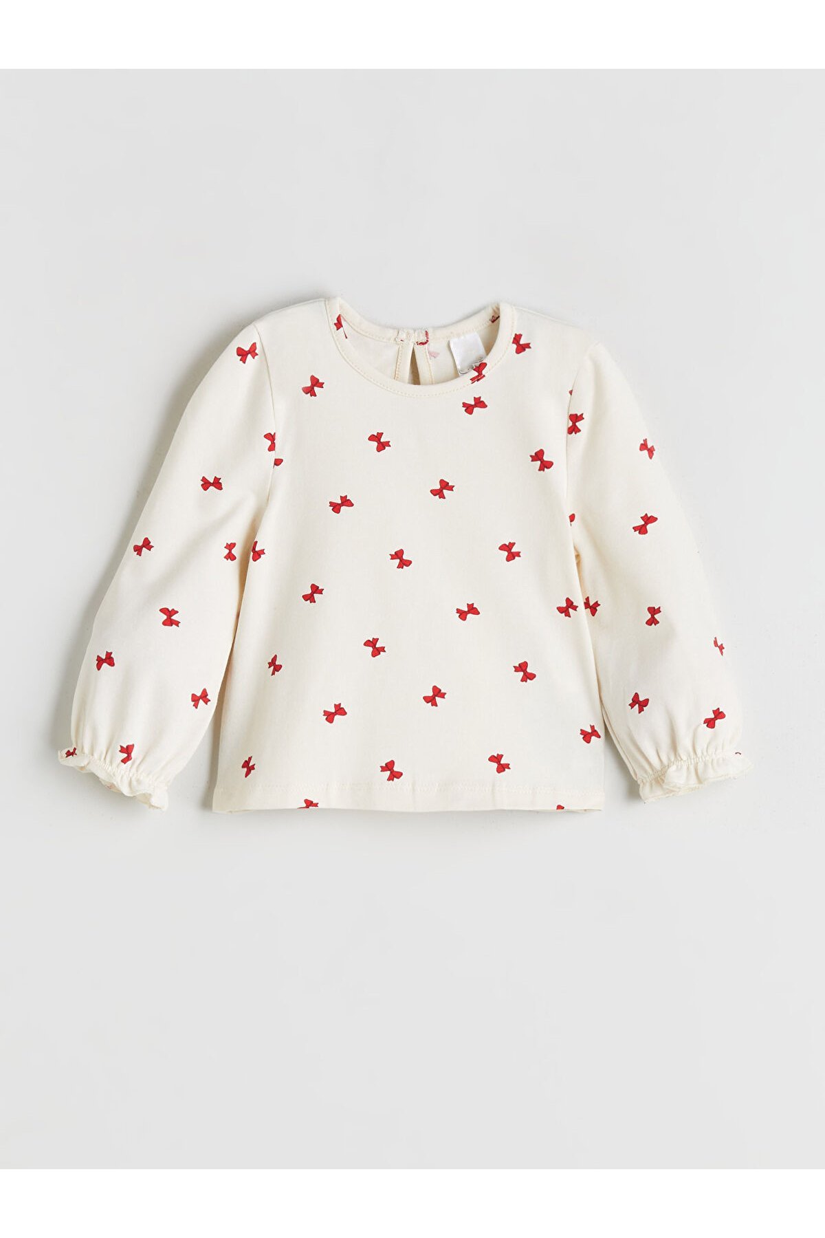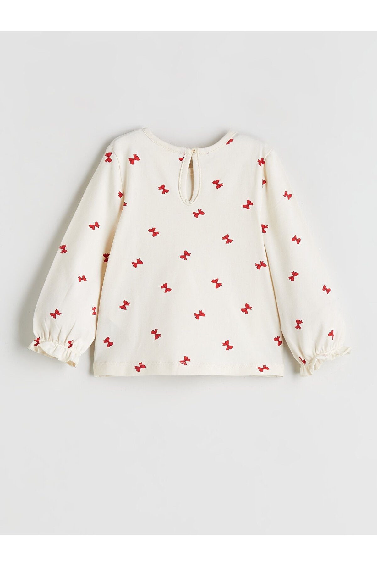 - Zarif Detaylar: Fiyonk baskılı yakası/kolları fırfırlı pamuklu bluz.