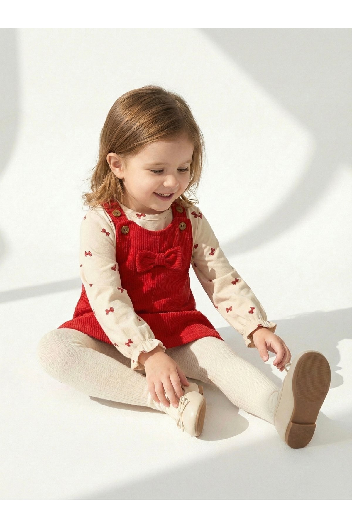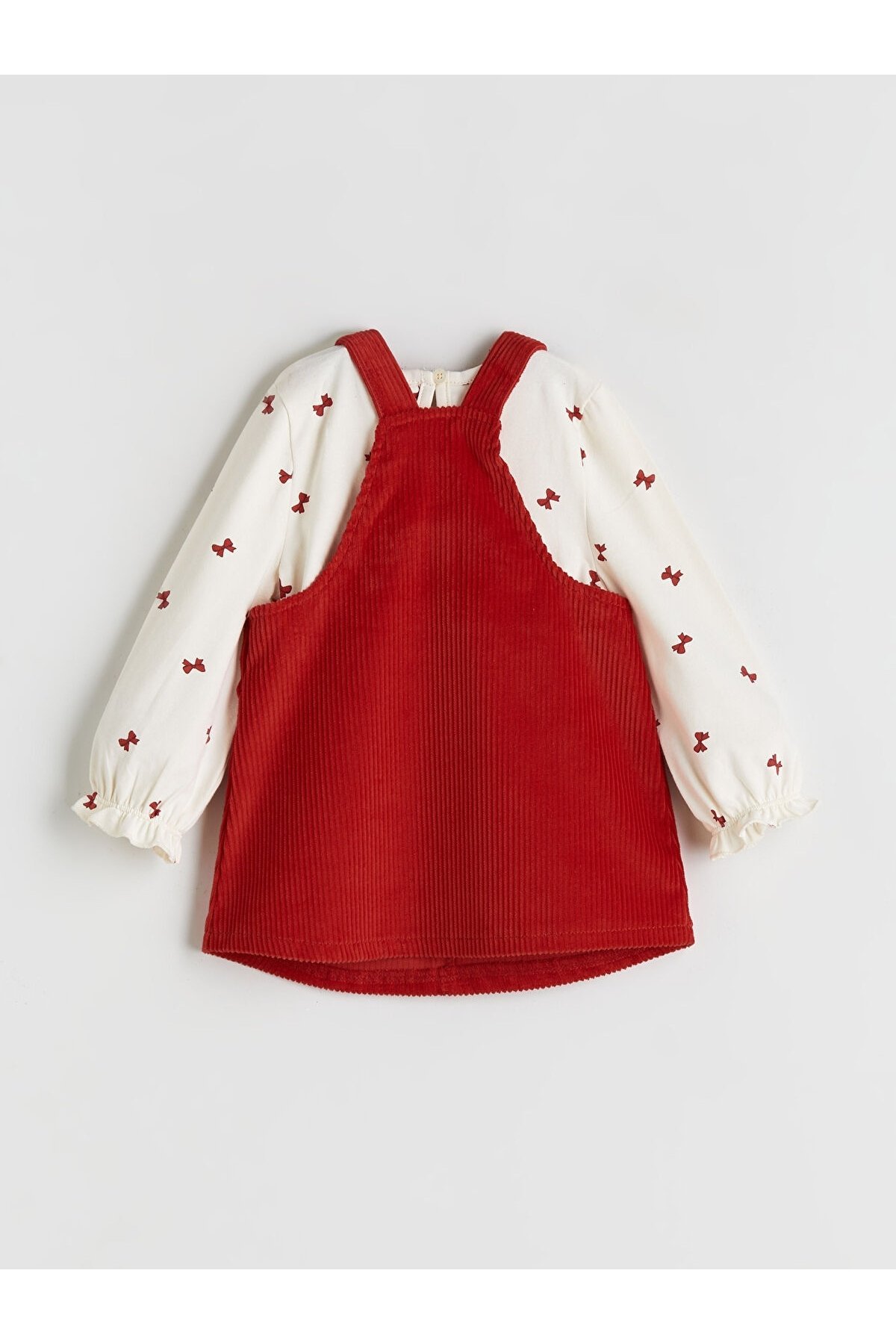 Kız bebek jile t-shirt takım – Kiremit kırmızı fitilli kadife askılı elbise ve fiyonk baskılı uzun kollu iç bluz. 0 aydan 4 yaşa kadar bebekler ve çocuklar için LC Waikiki kalitesinde vintage görünümlü 2’li set.