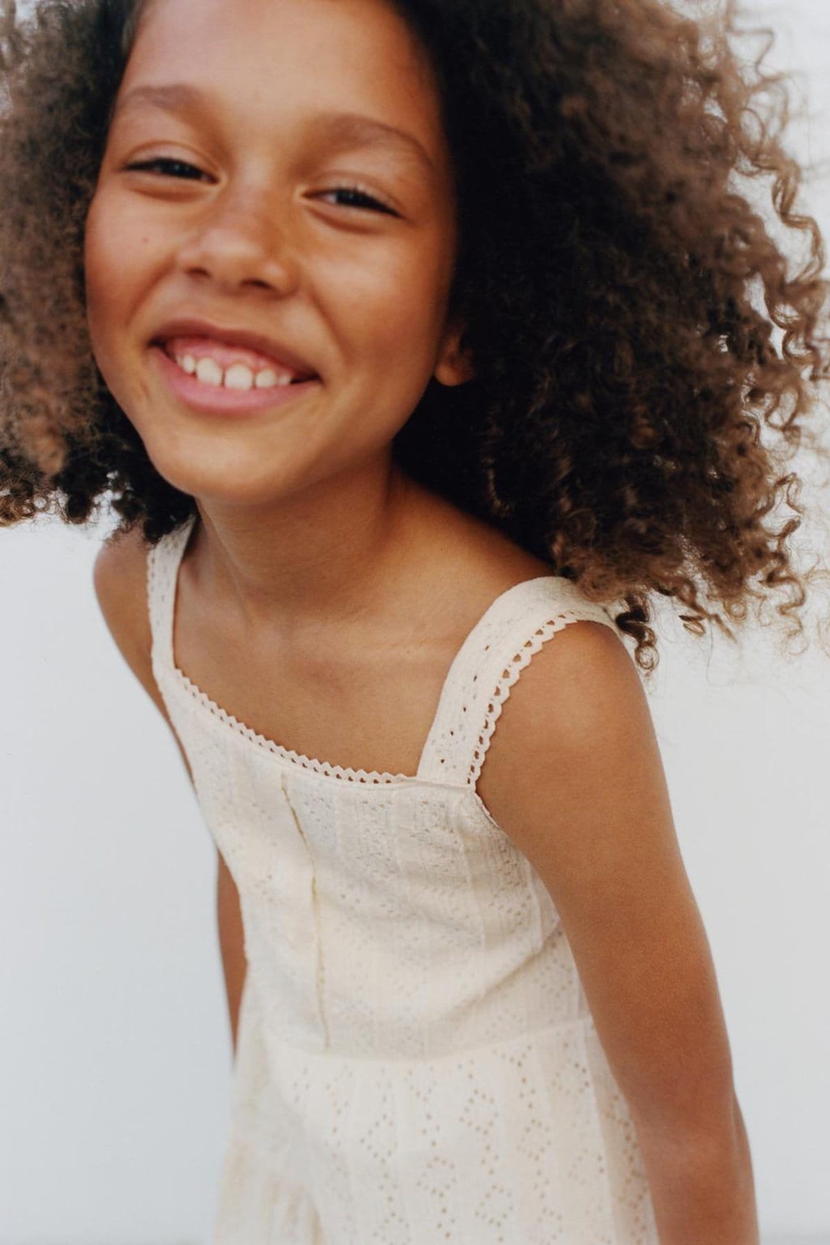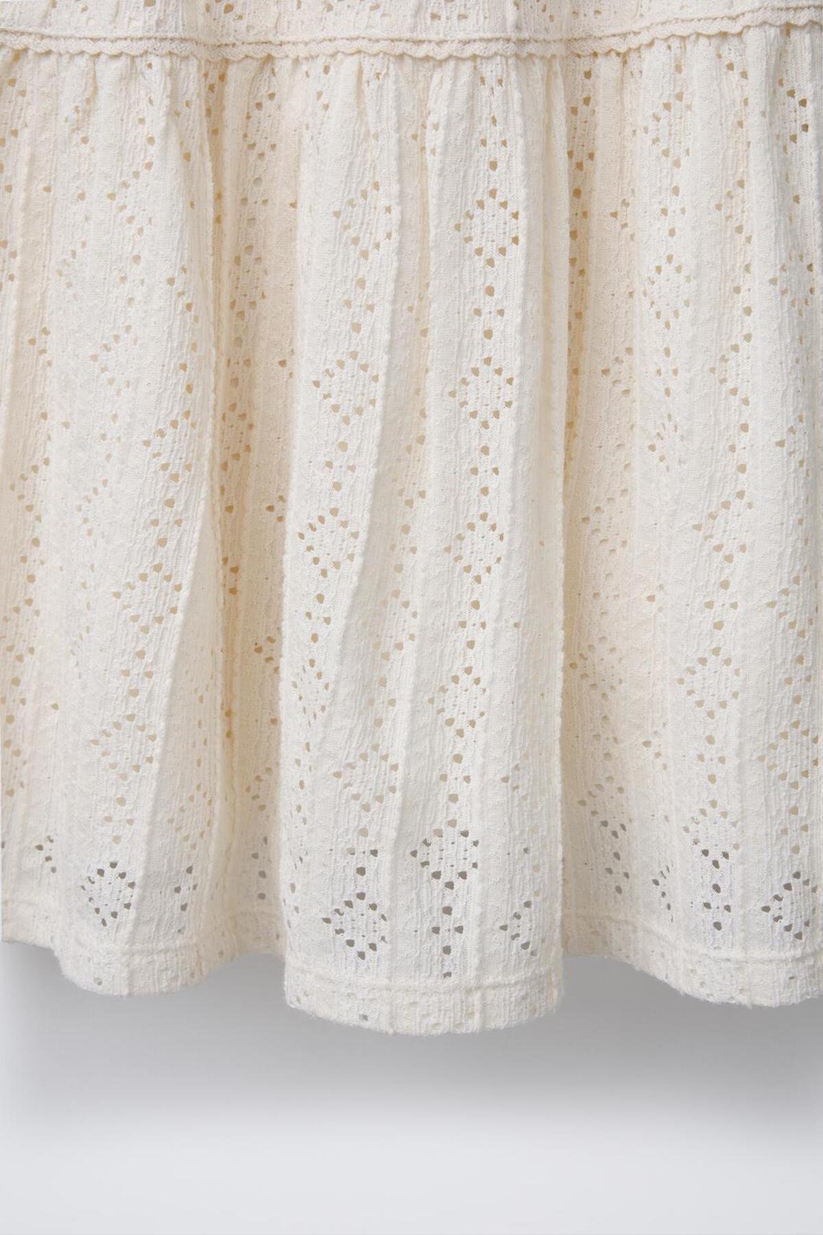 Tüm yüzeyi fisto (işlemeli/delikli) kumaş, önü düğmeli, eteği kat kat (tiered) dökülen şık krem rengi yazlık parçamız. 6-14 yaş için ZARA tarzı, ince askılı, cildi terletmeyen özel günler için en çok aranan çocuk giyim elbiselerinden biridir.