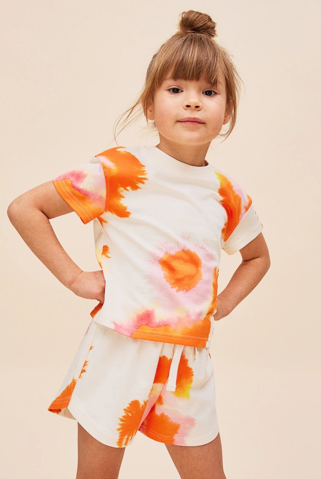 Kız çocuk batik desenli şortlu takım, turuncu rengi ve rahat kalıbıyla 2-10 yaş arası minikler için enerjik, konforlu ve şık bir yazlık giyim seçeneğidir.