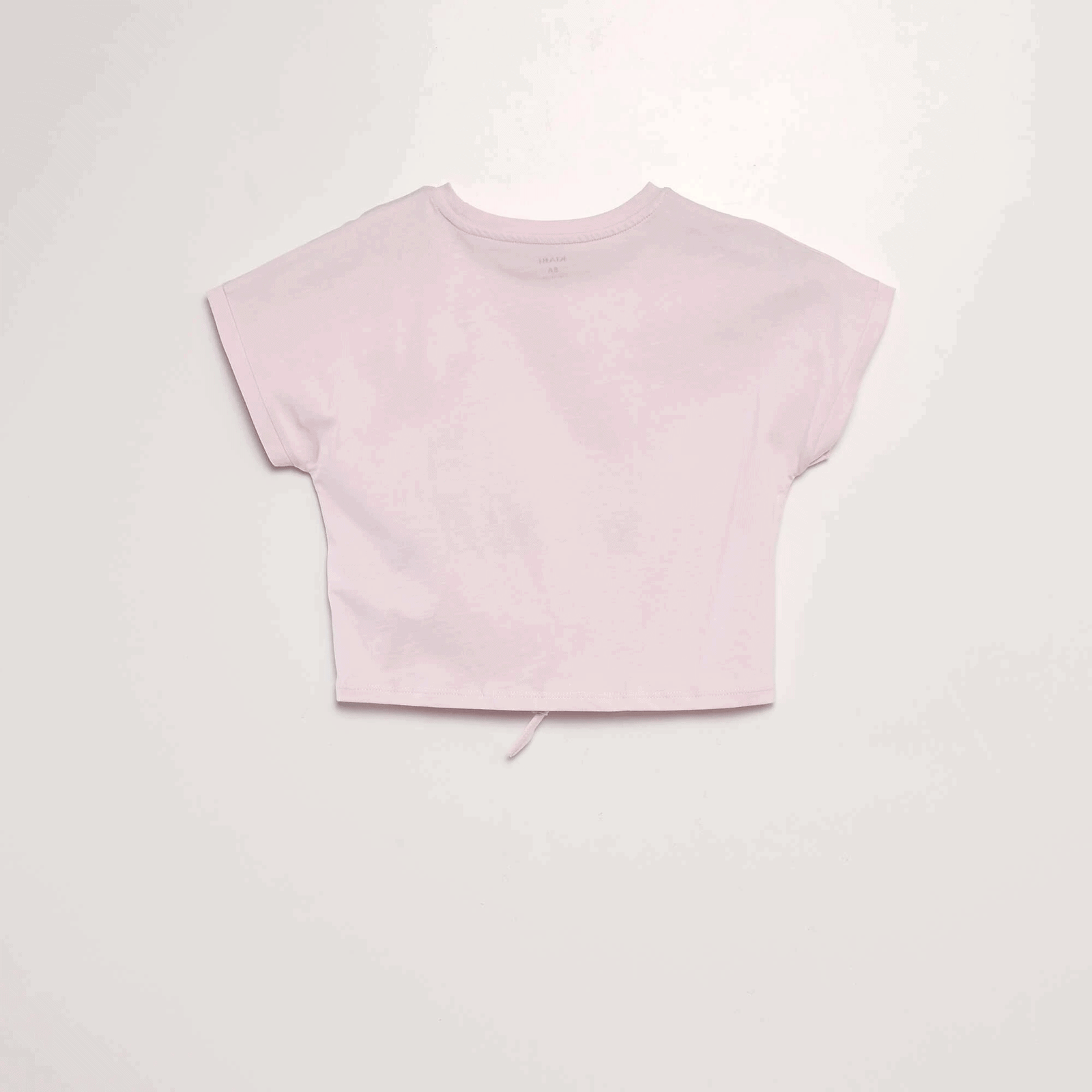 Kız çocuk etek ucu bağcıklı t-shirt, pembe rengi ve rahat kalıbıyla 3-12 yaş arası minikler için modern, eğlenceli ve konforlu bir yazlık üst giyim seçeneğidir.
