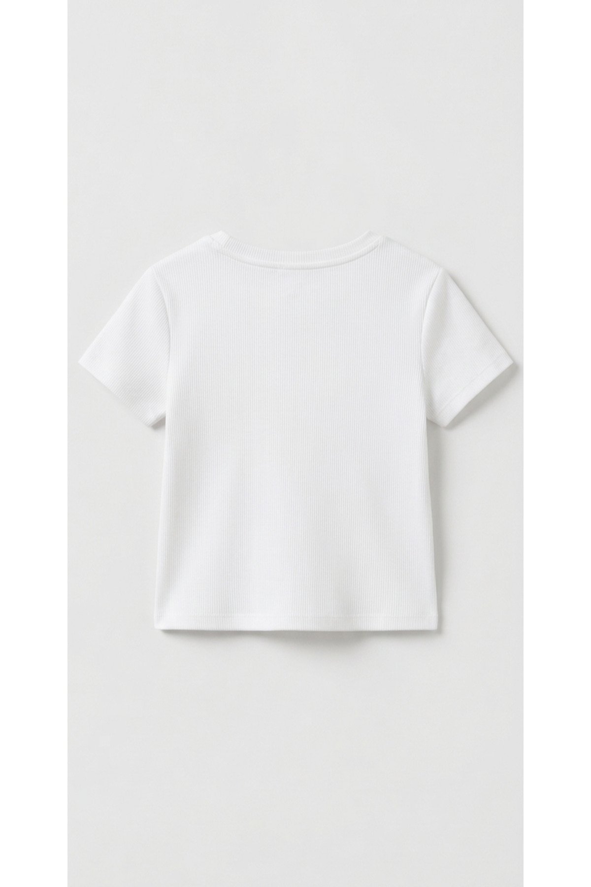 Kız Çocuk Fiyonklu Fitilli T-Shirt – Temiz ve ferah beyaz renkte, yaka omuz kısımlarında damla şeklinde dekoltesi ve fiyonk süslemesi bulunan zarif tişört. Çocuğunuzun dilediği gibi hareket etmesini sağlayan esnek ve dokulu dikey fitilli kumaş. 3-12 yaş kız çocukları için günlük ve şık kullanıma uygun tasarım kaliteye sahip kısa kol tişört. Çocuk giyim online alışveriş.