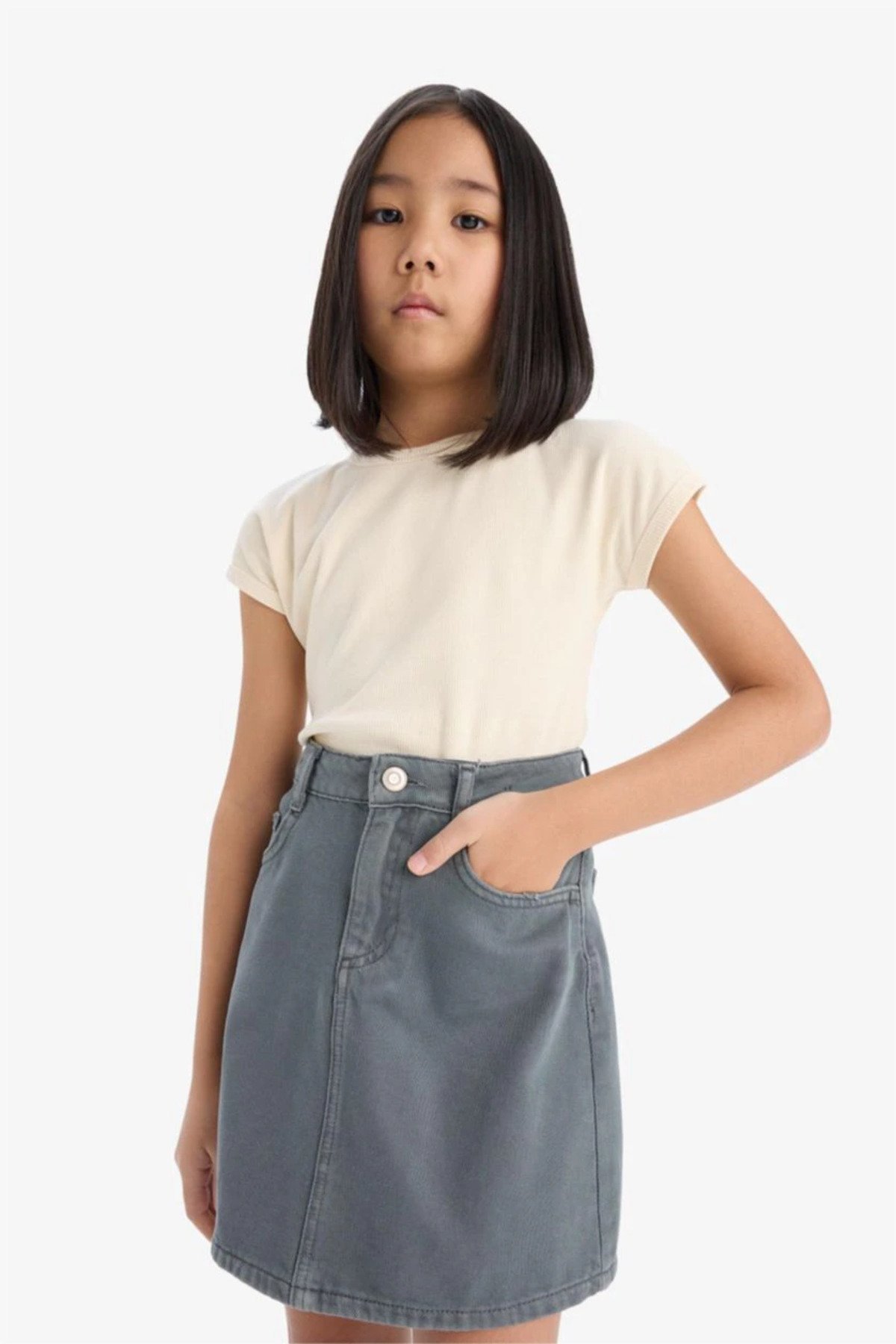 Kız çocuk gabardin etek – Nötr gri renk, A-kesim (çan form) ve sportif cepli tasarım. 6-14 yaş arası kız çocukları ve gençler için DeFacto kalitesinde esnek, dayanıklı ve 4 mevsim etek.