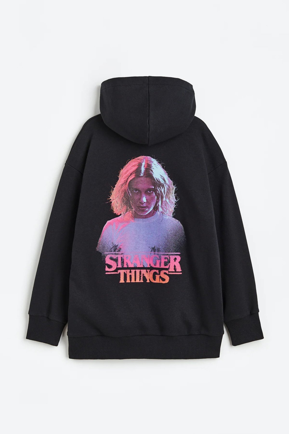 Tam fermuarlı (zip-up), ön yüzünde logo, sırtında devasa “Stranger Things” baskısı bulunan siyah renk şapkalı kalın sweatshirt. 10-15 yaş arası için H&M tarzı, salaş ve düşük omuzlu bol (oversize) çok satan çocuk giyim hırkası.