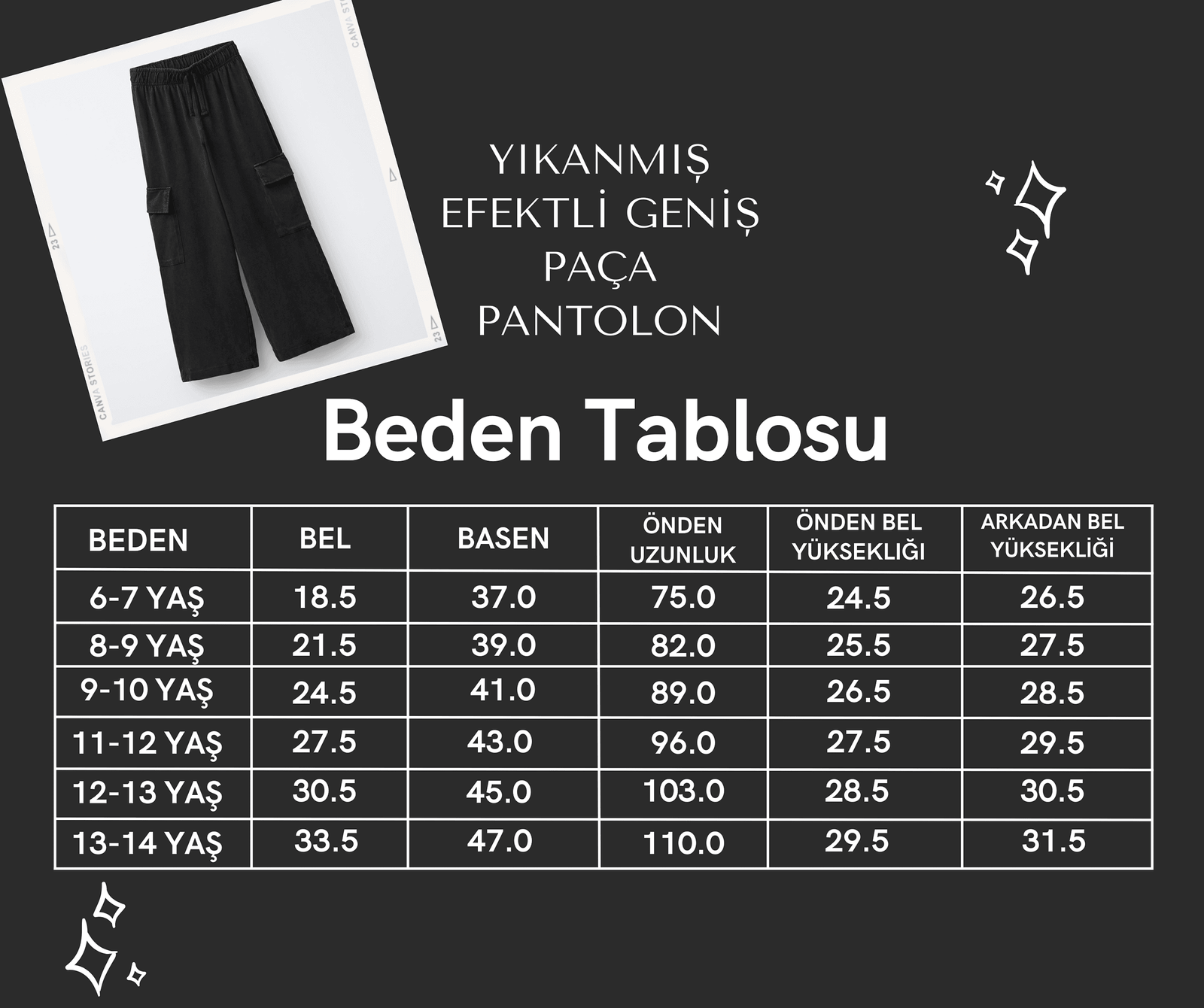 Kız Çocuk Yıkanmış Efektli Geniş Paça Kargo Pantolon, 7-14 yaş arası kız çocuklarının modern ve rahat stilini yansıtan özel bir tasarımdır. Şık siyah rengi ve yıkanmış efektli geniş paça kesimiyle öne çıkan bu model, günlük hayatta da özel kombinlerde de tercih edilebilecek çok yönlü bir parçadır. Ürün Kodu: ZEYDER1893.
